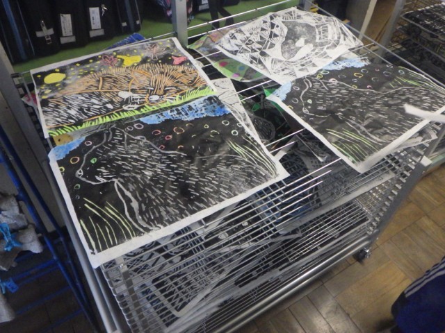 木版画の様子です。版から写した紙の裏に色を付けています。※5日の様子です。