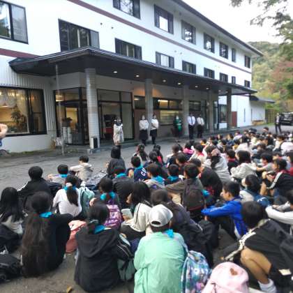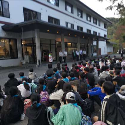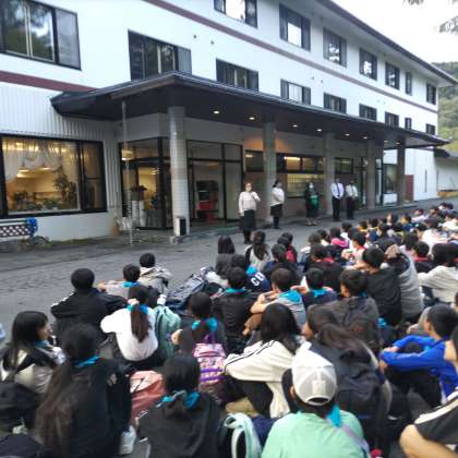 宿舎であるホテル花の季に到着しました。到着の式の様子です。