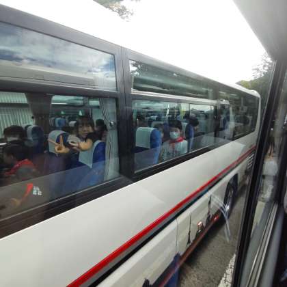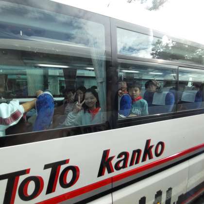 華厳の滝を出発。その前に、1組のバスから見える2組のバス。そして、いろは坂に