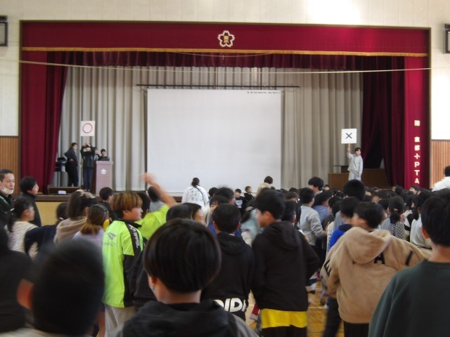 〇✕クイズでは、学校内でのルールやマナーについて問題が出され、高学年も低学年もほとんどの人が正解を選ぶことができました。