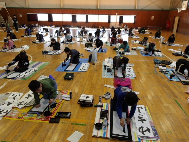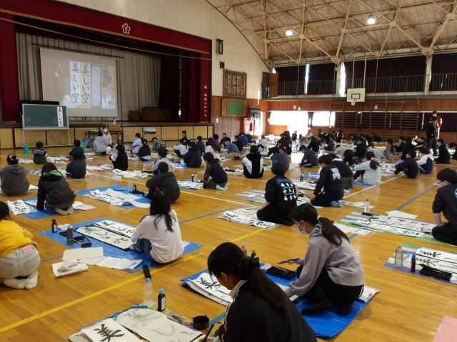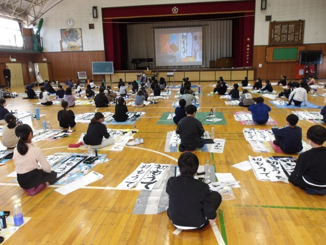 【書き初め】に向けて、4~6年生が学年ごとに体育館で練習をしていました。