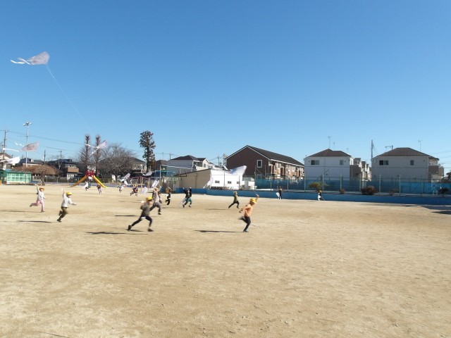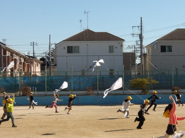 青空の下、1年生が凧揚げをしていました。