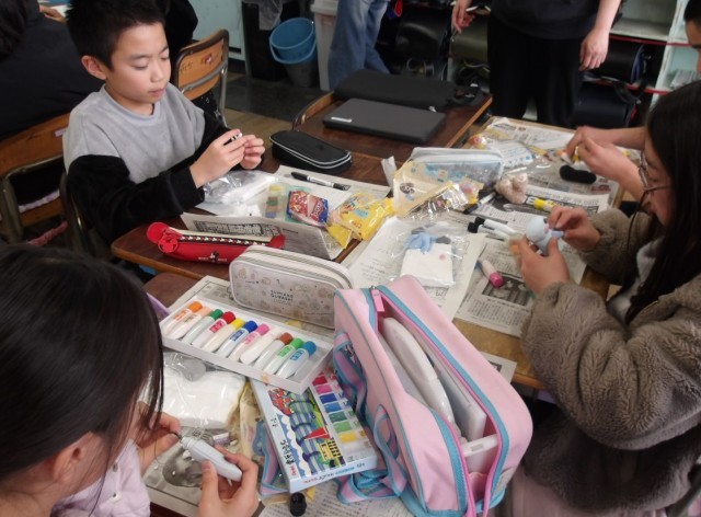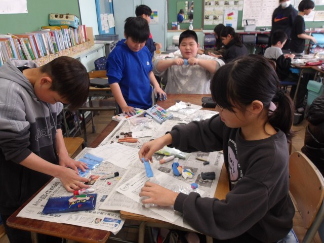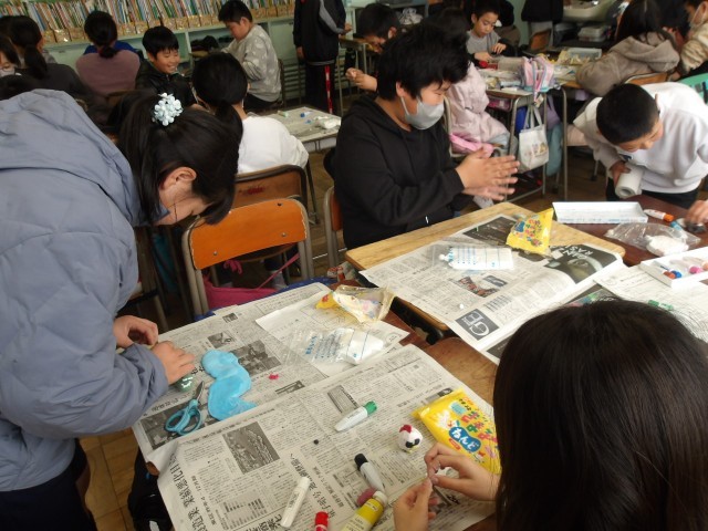 グループごとにオリジナルストーリーを考え、粘土で登場キャラクターを制作中でした。