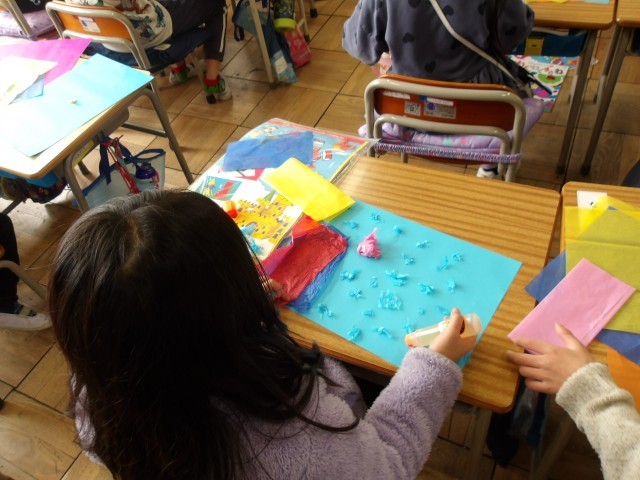 はながみをビリッとちぎったり、ギュッとにぎったりしながら、絵を制作しています。