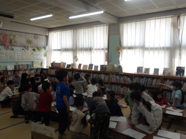 今日は2年生が、おはなしの部屋の使い方や本を戻す場所について確認していました。