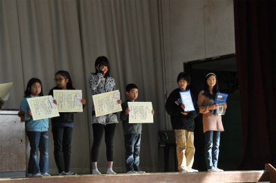 表彰式では京葉ガス絵画コンクールで最優秀賞をとった子をはじめ15名が壇上に上がり、校長先生から賞状を受け取りました。