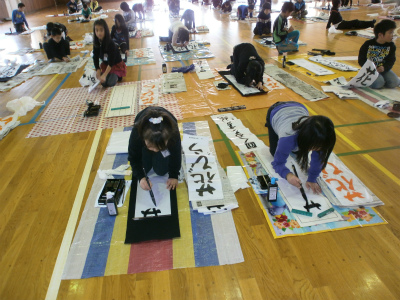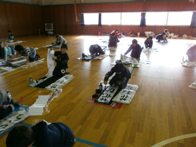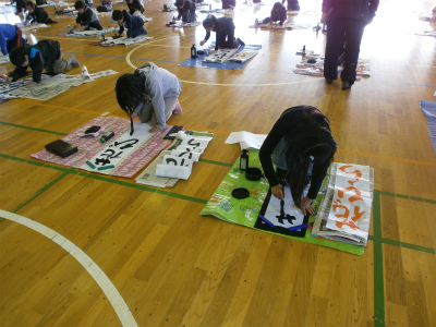 10日(木)の3〜4時間目に体育館にて、書き初め大会を行いました。講師として、元小学校長奥山喜和子先生に来ていただき、一所懸命作品を仕上げました。
