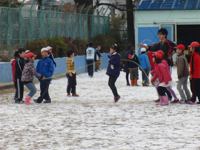 雪の残る校庭でしたが、ずっとできずにいた1,3,6年生の体力つくりがようやく行えました。