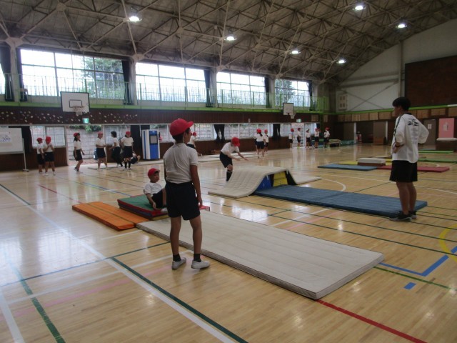 5年生は体育の学習で「器械運動(マット運動)」に取り組んでいます。この日は台上前転の練習を行いました。
