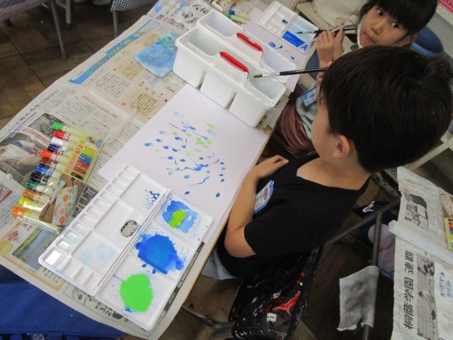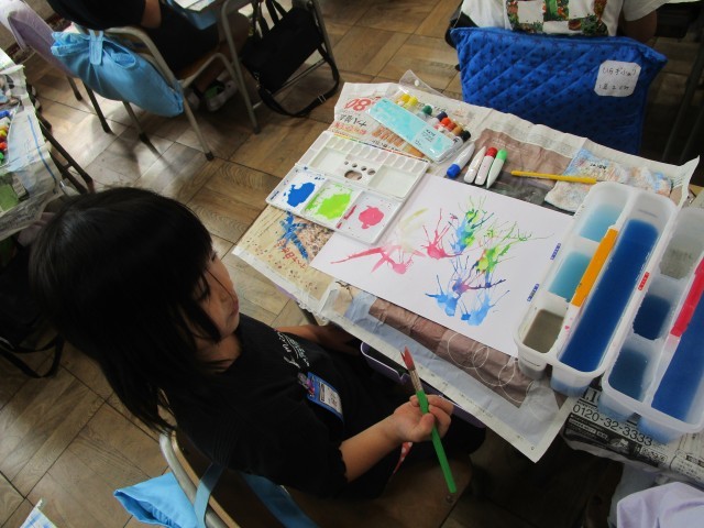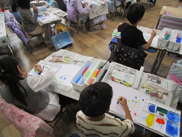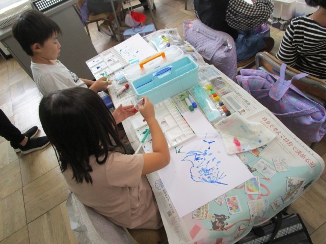 「こっちに曲がった!」「きれいにできた!」といった声があがり、偶然できた模様に驚いたり喜んだりする姿が見られました。それぞれの作品には、子どもたちの発想や遊び心があふれており、楽しい雰囲気の中で創作活動に取り組んでいました。