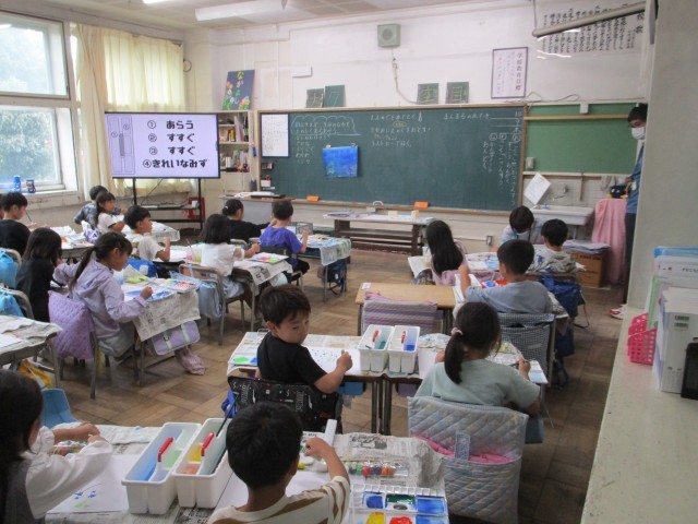 1年生は図工の授業で、「ストローで吹いて模様を作ろう」という活動に取り組みました。画用紙の上に絵の具をたらし、ストローで息を吹きかけて広がる模様を楽しみながら、自分だけの表現を工夫していました。