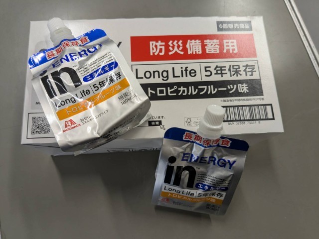 これまで1年ごとの交換を行っていた防災備蓄品ですが、最近では長期保存が可能な商品も増えてきました。物価高騰やアレルギー対応なども考慮し、今回は防災備蓄用として「inゼリー(5年保存可能)」を新たに購入しました。