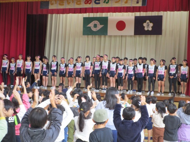 本日、明日の陸上大会に出場する5・6年生の代表児童を応援する壮行会が行われました。出場者一人ひとりの名前が呼ばれると、全校児童から温かい拍手が送られ、学校全体での応援ムードが高まりました。