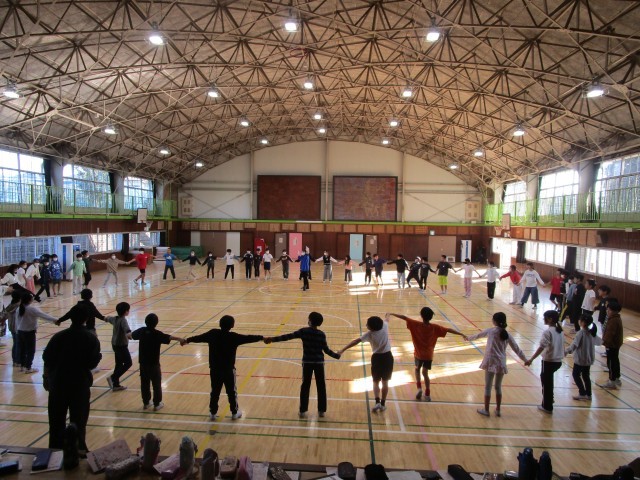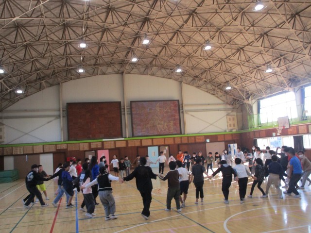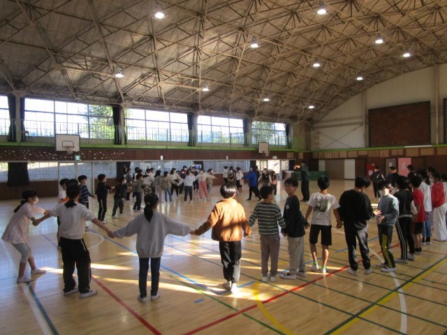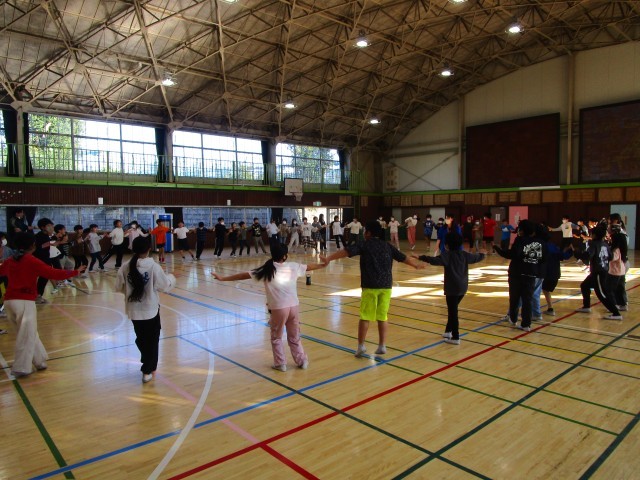 体育館に音楽が流れると、児童たちはリズムに合わせてステップを踏み、手を取り合いながら楽しそうに体を動かしていました。はじめは動きに戸惑う様子も見られましたが、繰り返すうちに少しずつリズムをつかみ、互いに教え合いながら協力する姿が見られました。