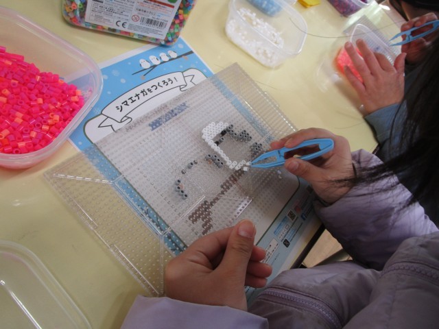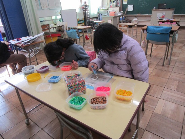 児童たちは、色とりどりのビーズを使って、自分の好きな形や模様を丁寧に並べていきました。細かい作業に集中しながらも、「この色にしよう」「ハートの形にしたい」など、楽しそうに工夫をこらして作品を仕上げていく姿が印象的でした。
