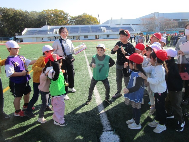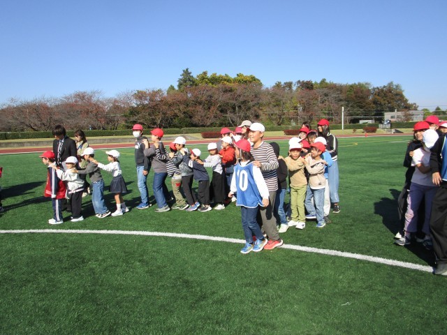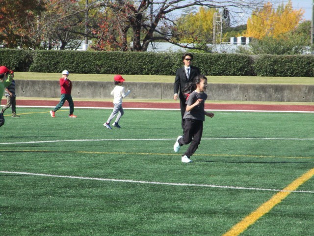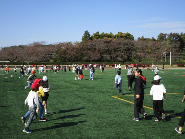 後半は、広いフィールドを使っての逃走中ゲーム。男の先生方がハンター役となり、子どもたちはグループで作戦を立てたり、助け合ったりしながら一生懸命に走っていました。