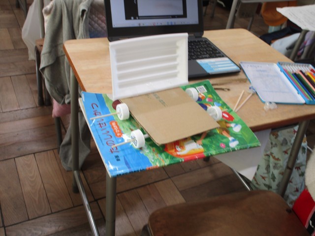 友達とコツを教え合いながらよく動くものを作りました。輪ゴムを使うものや風を受けて動くものなどを作っていました。