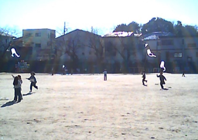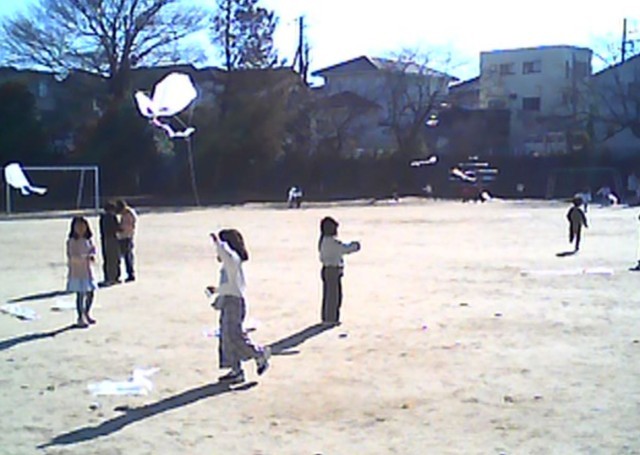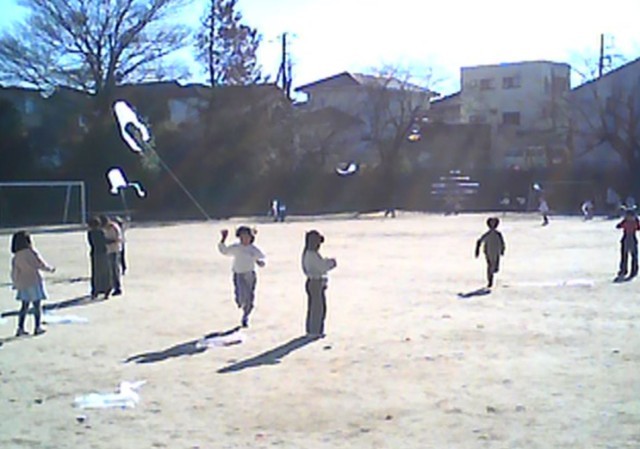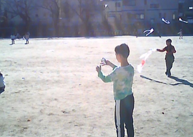 自分たちで絵を描いて作ったオリジナルの凧を手に、冬の風を感じながら校庭を思いっきり駆け回りました。