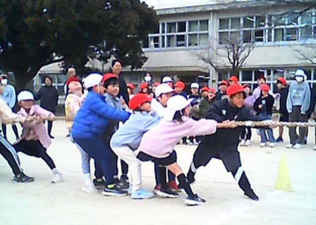 各グループ力を合わせて綱を全力で引き、まわりで見ている児童からも応援の声が聞こえ、