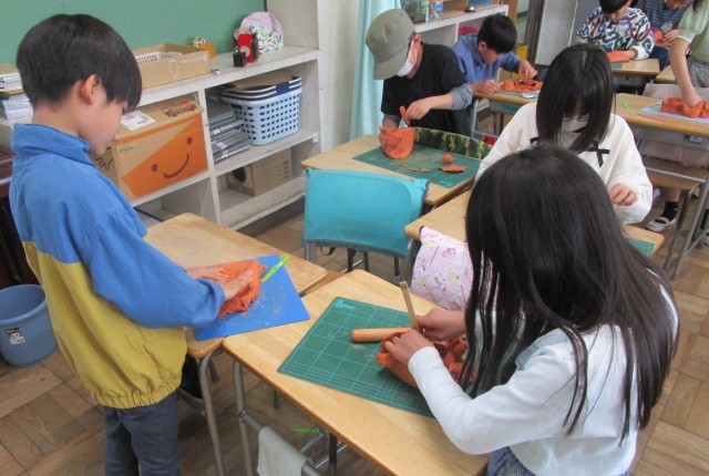 図工では、「ぺたんこねん土でつくってみると」に取り組んでいます。