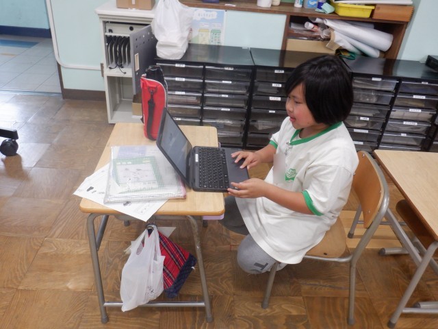 理科の教科書を読んでいます。気になる言葉があると、進んでタブレットで調べていました。