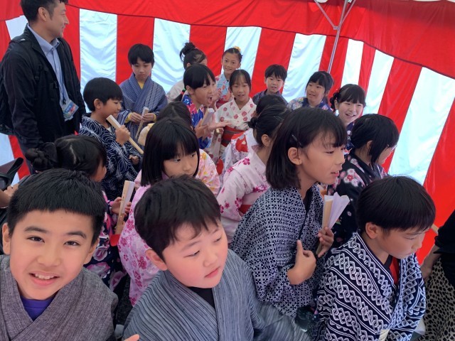 いよいよ本番。おしゃらく保存会の皆様と南部小との合同発表は、市民まつりステージの重要なトップバッターです。雨が降りしきる中でしたが、4年生の皆さんは練習の成果を発揮し、息の合った演技、一生懸命な姿で観衆を感動させることができました。保存会の皆様、着物着付けの先生方、保護者の皆様、たくさんのご協力に感謝いたします。誠にありがとうございました。