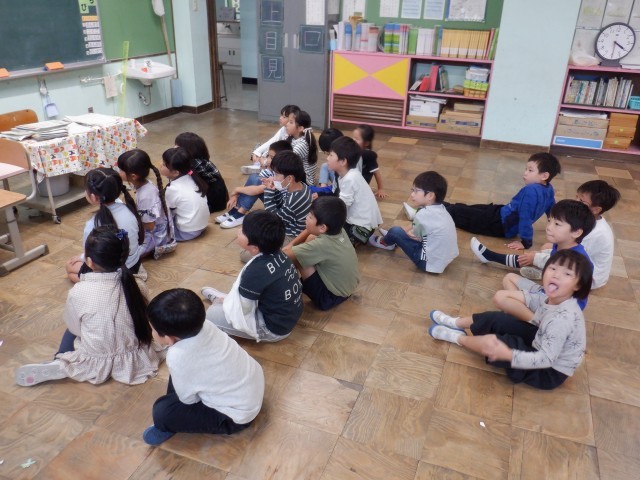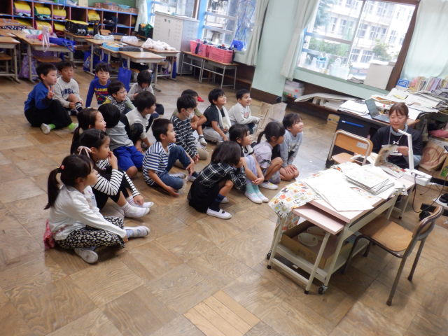 1年1組のシークレット読み聞かせです。どの先生が来るか、当日のお楽しみです。