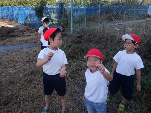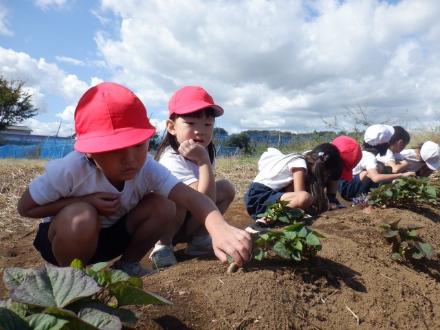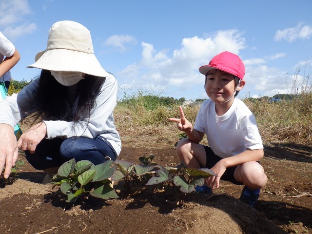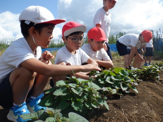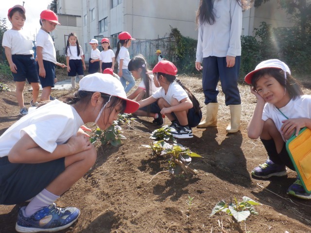 学校の畑で育ててきたサツマイモが大きくなりました。どれくらい実が成っているか、掘ってみないとわかりません。とても楽しみです。