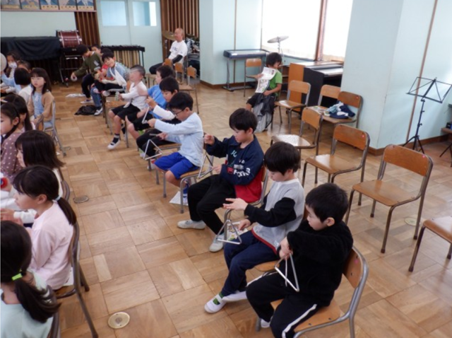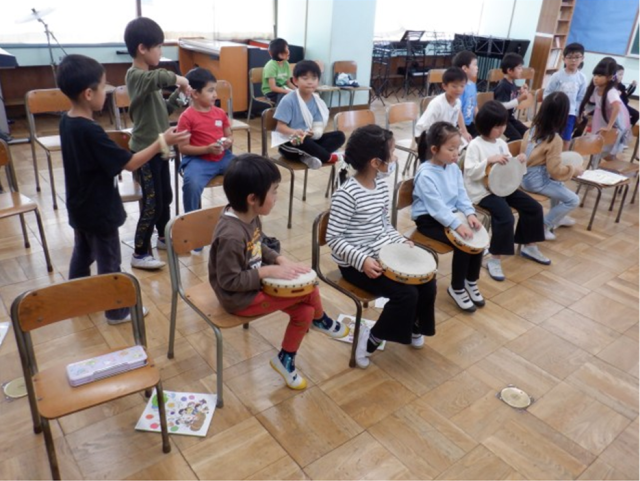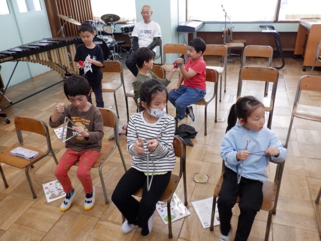 曲を聞いて、好きな打楽器で音を加えていました。タンバリンやトライアングル、カスタネットなど、楽しそうにいろいろな音を出しています。