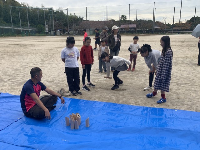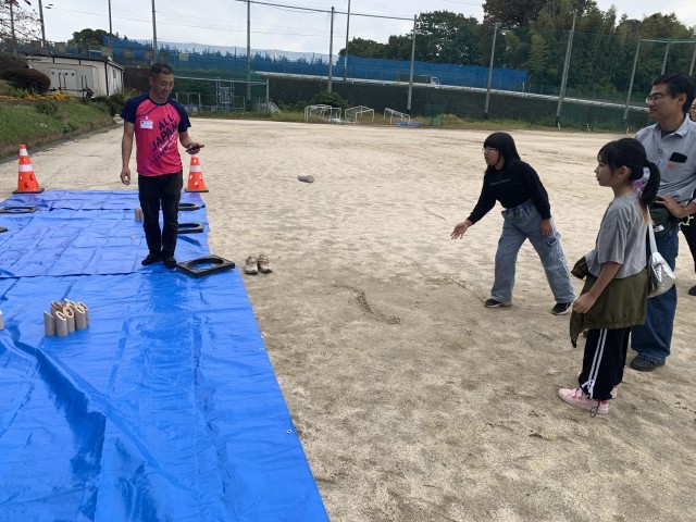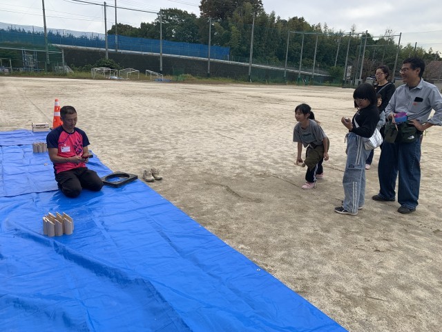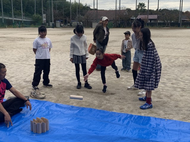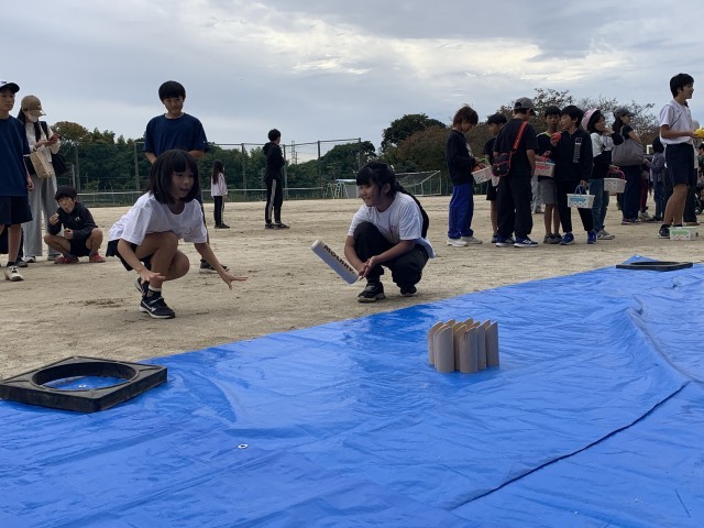 昨晩の豪雨が終わり、ようやく青空が見えました。四中グラウンドは水はけがよく、無事にあそび&もちつき大会を実施することができました。あそびコーナーの一番人気はモルックでした。