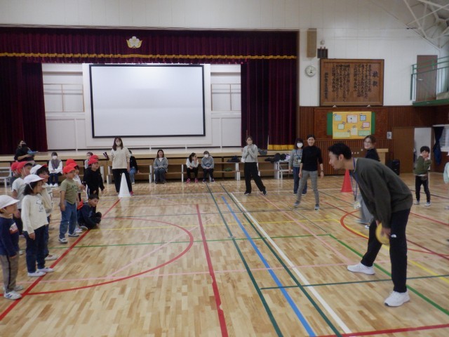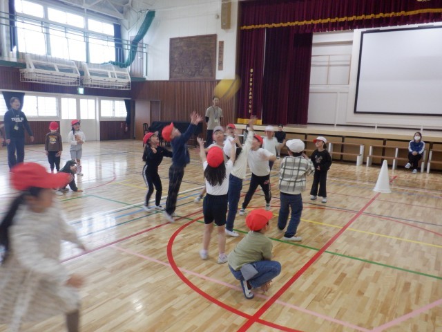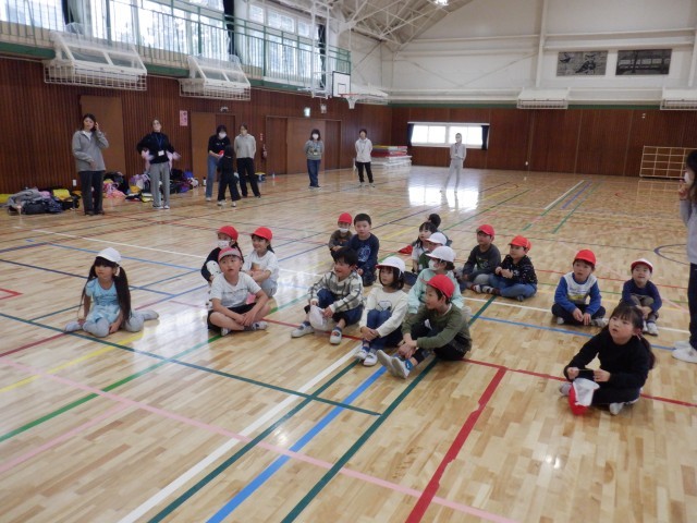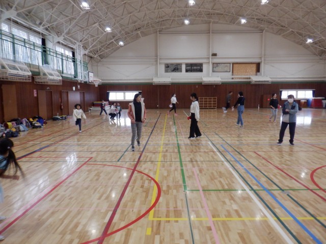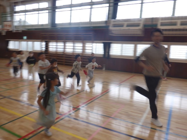 保護者の皆様と1年生達で、しっぽ取りの鬼ごっこをしました。お父さんお母さん達はとても足が速かったですが、最後は数の理で子ども達が勝利しました。ドッジボールでは、最前線に出て手を広げてボールを欲しがる子ども達に少々困惑しましたが、とても盛り上がりました。ルールよりも思いのままに動く姿がかわいかったです。
