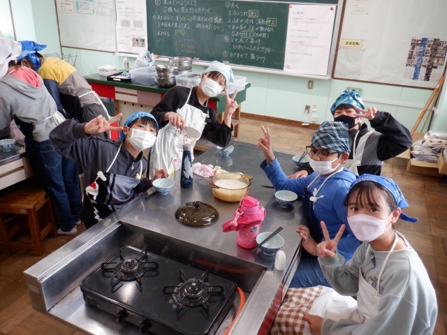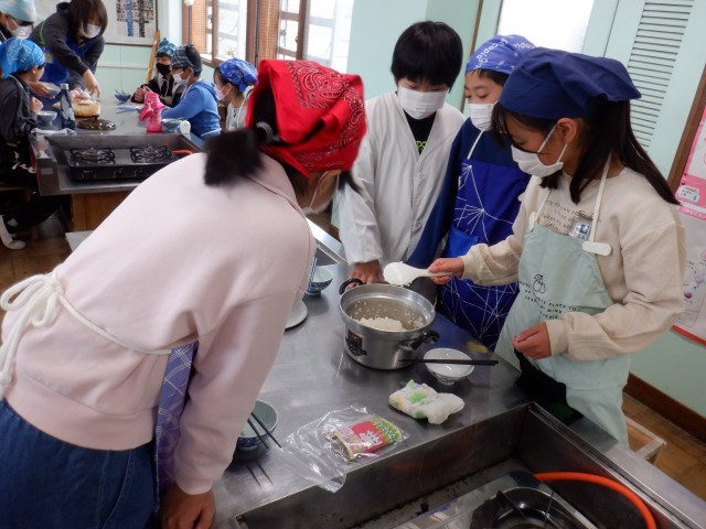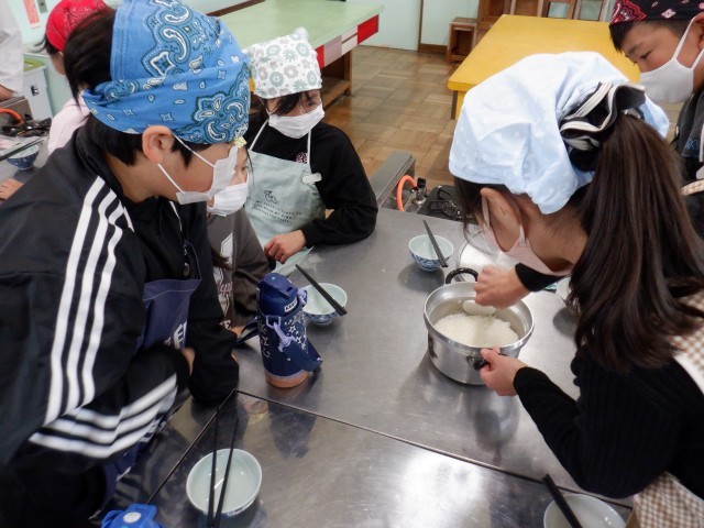 調理実習で、ガラス鍋や鍋で米を炊きました。炊飯器を使わずに炊くと、焦げやすく難しいですが、いつも以上に美味しくなった米に感動していました。おこげも美味しかったようです。