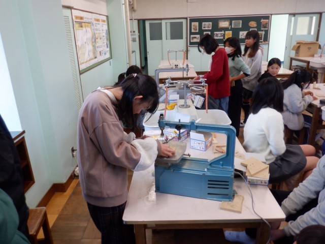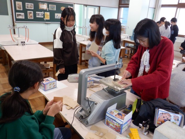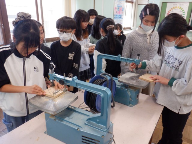 鉛筆で描いた下描きに沿って、板を電動ノコギリで切っていました。細かく器用に切り分けていて、さすが6年生でした。