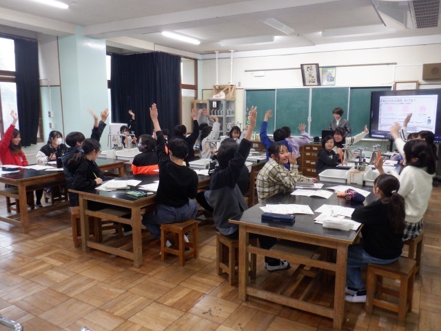 薬剤師の澤地先生をお招きして、薬物やスマホ利用について講話を聞きました。薬物については、馴染みのない情報ながらも、危険性がわかりました。スマホ利用については、とても身近な話題で、スマホ依存に当てはまるような利用の仕方がないか、日頃の生活を振り返りました。