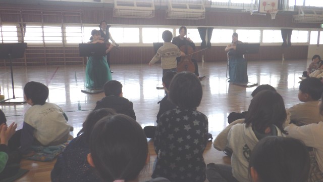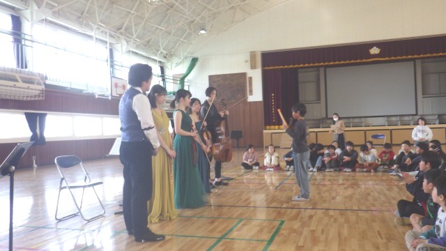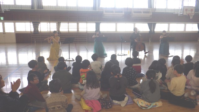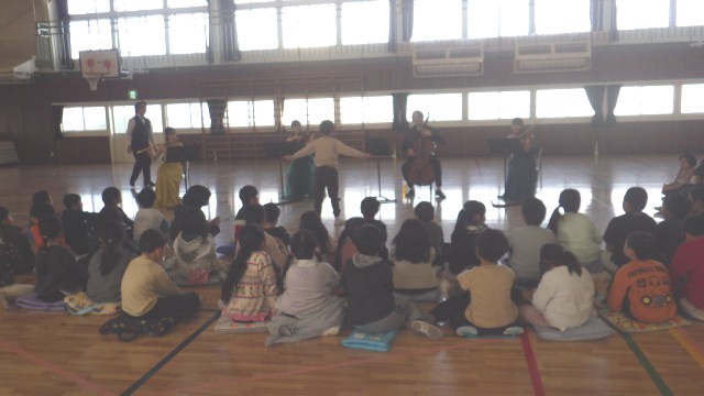 NPO法人「みんなのことば」様をお招きし、5名の楽団の皆様に演奏をしていただきました。校歌の練習もあり、声の出し方や歌い方を楽しく教えていただきました。みんな目が輝いていて、心に残る演奏会になったようです。