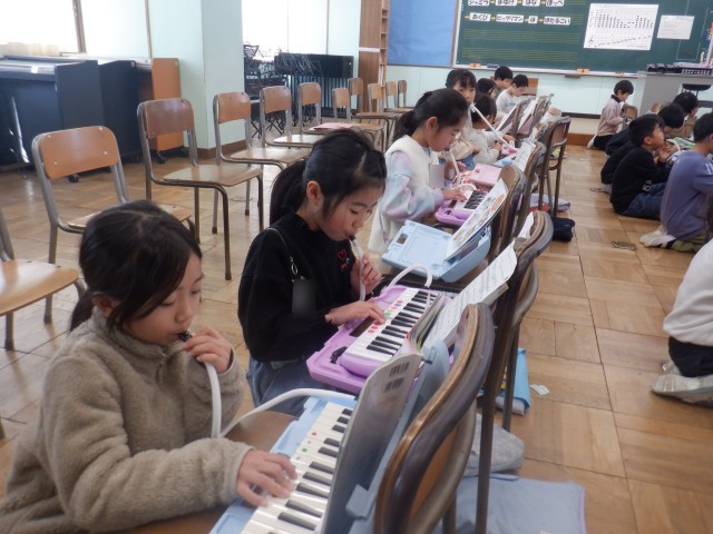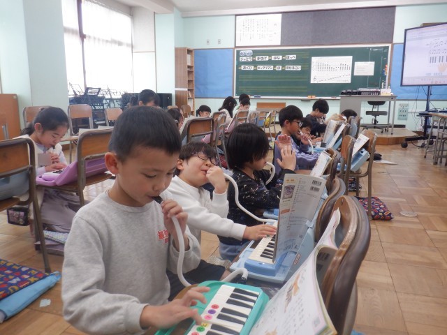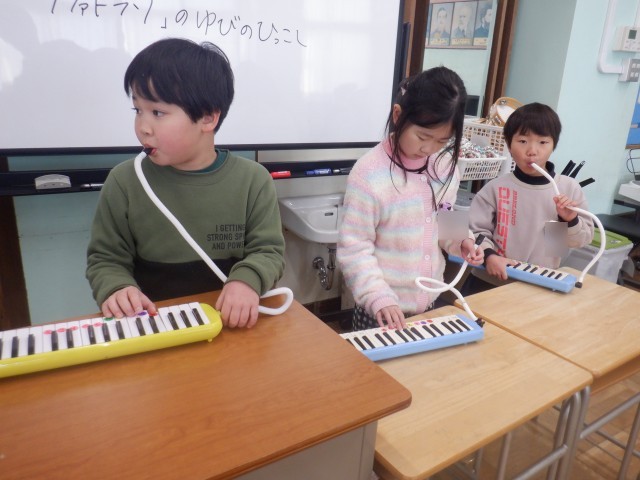 ピアニカで「小ぎつね」を弾いています。「山の中♪」の「ラファドラソ♪」が難しそうで、繰り返し練習していました。