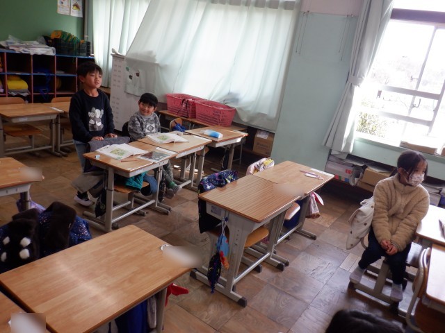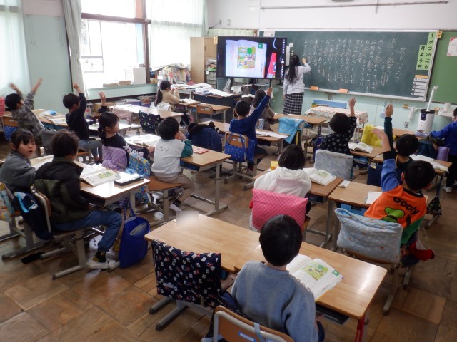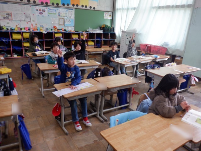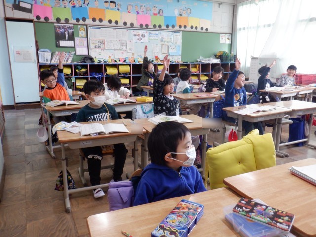 自分で考えて文をつくり、発表していました。「〇〇が~しています。」の短い作文ですが、次から次へと挙手をして、いくつも発表していました。