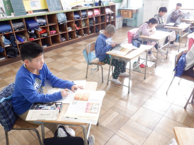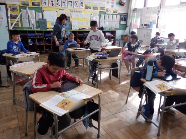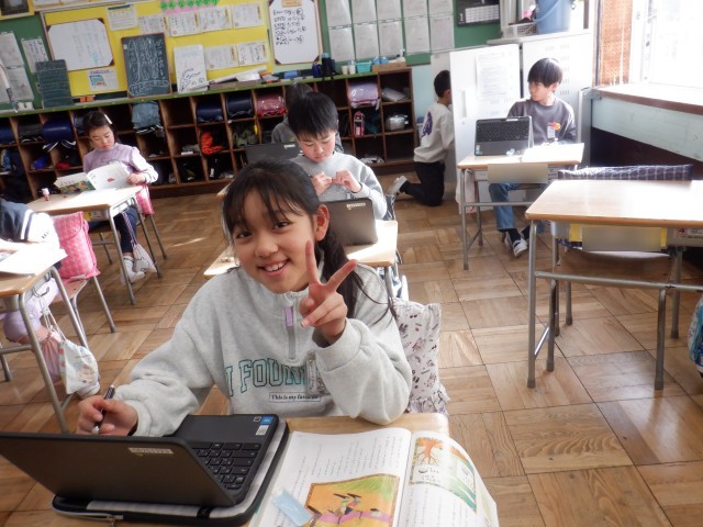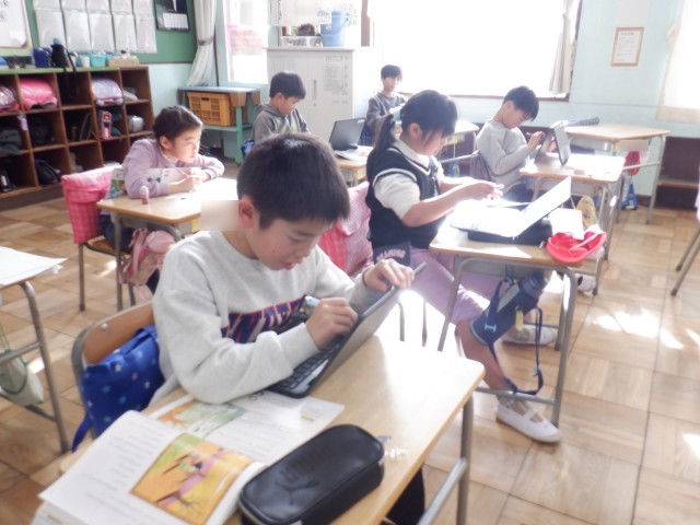 ちびまる子ちゃんとたまちゃんが出てくるお話でした。友だちのよさについて考え、クロームブックに考えを書いています。