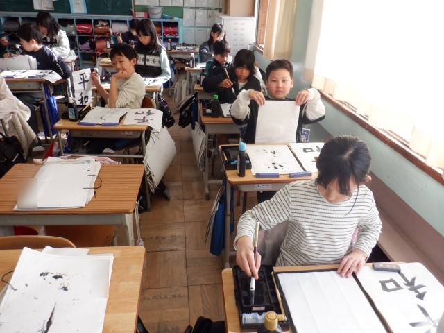 「平和」という字を書いていました。横画をかっこよくするにはどうしたらよいか、へんとつくいのバランスはどうしたらよいか、考えながら書いていました。