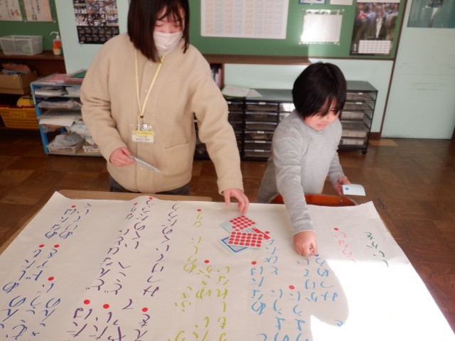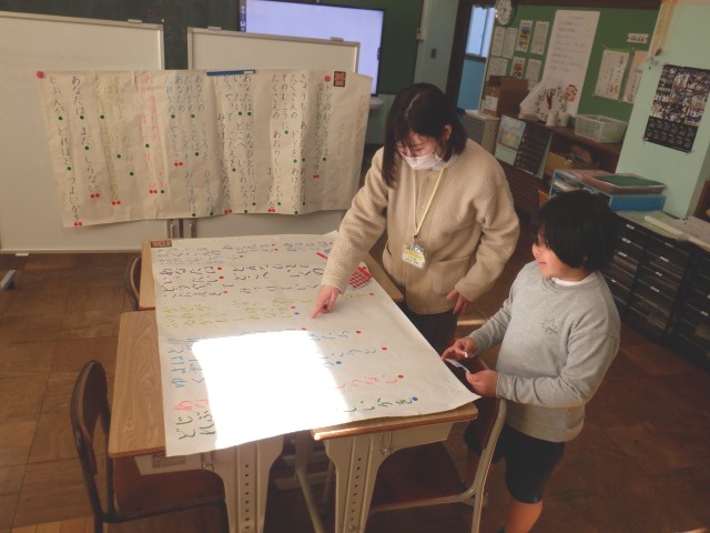 全校音読に向けて、詩の読み方を考えていました。間の取り方を考え、シールを貼っているところです。