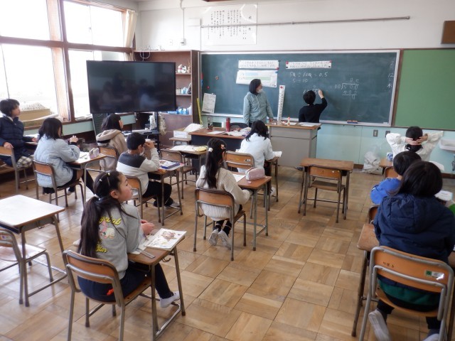 「1倍」よりも小さい小数倍の計算を学習していました。「かけているのに答えが小さくなる」のですが、集中していたのでつまずきなく進めそうです。