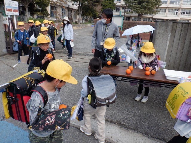 元気な笑顔で下校します。今日一日、楽しいことがあったのかな。また来週、元気に登校してきてくださいね。