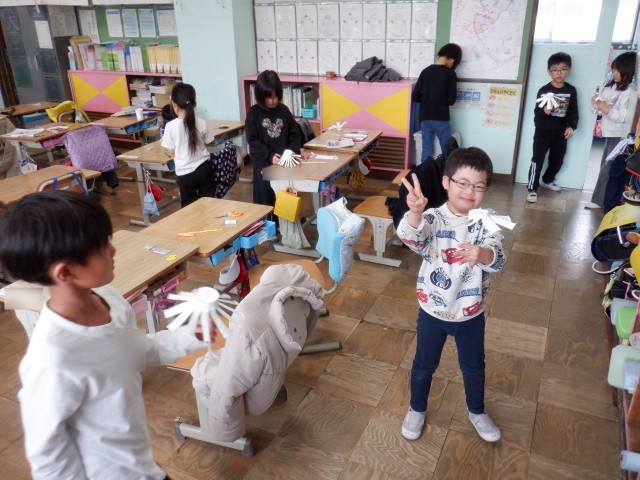 紙コップで風車を作りました。走ると風車が回り、みんな大喜びで見せてくれました。