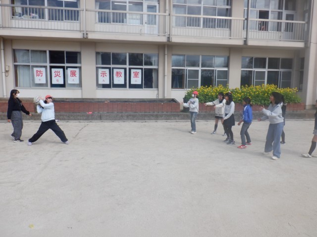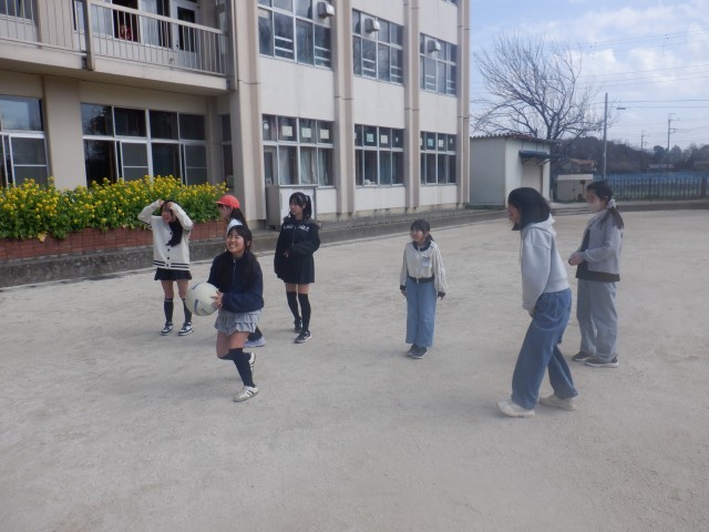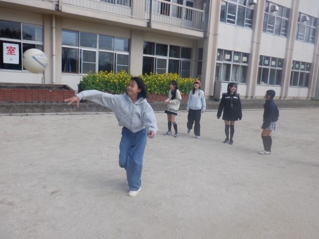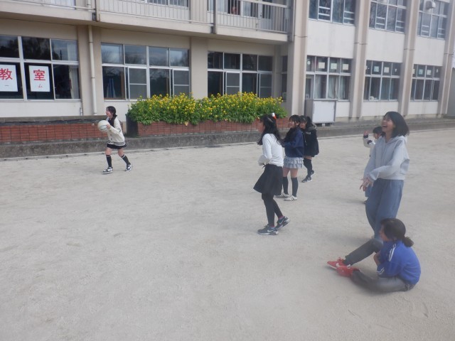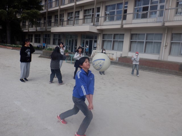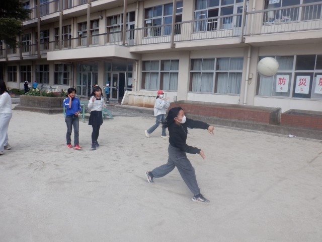 今日は6年生だけが5時間授業のため、昼休みは6年生だけで校庭を自由に使っていました。女子はドッジボールをしています。投げたり打ったりして、大盛り上がりでした。