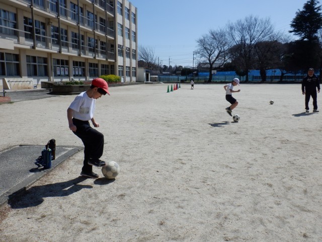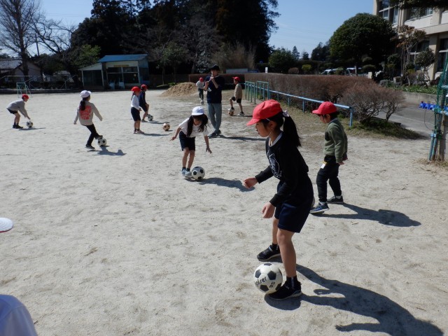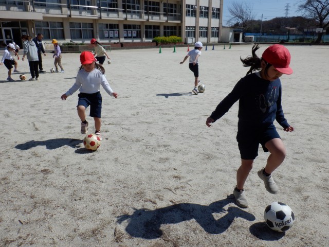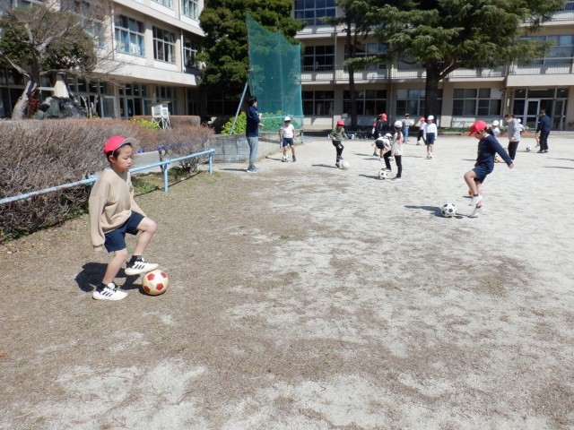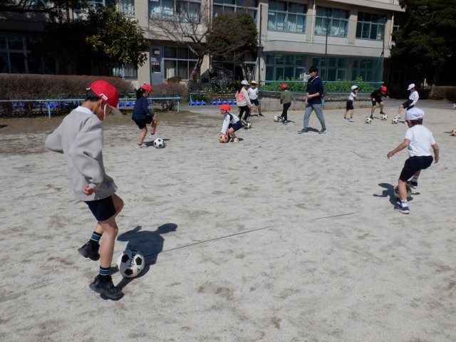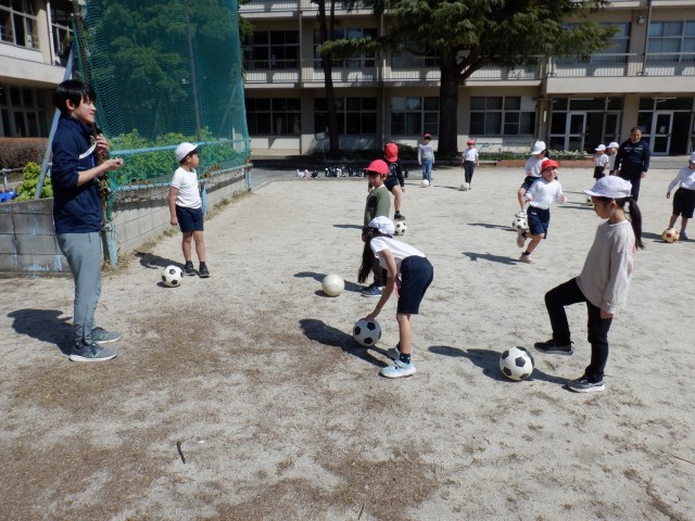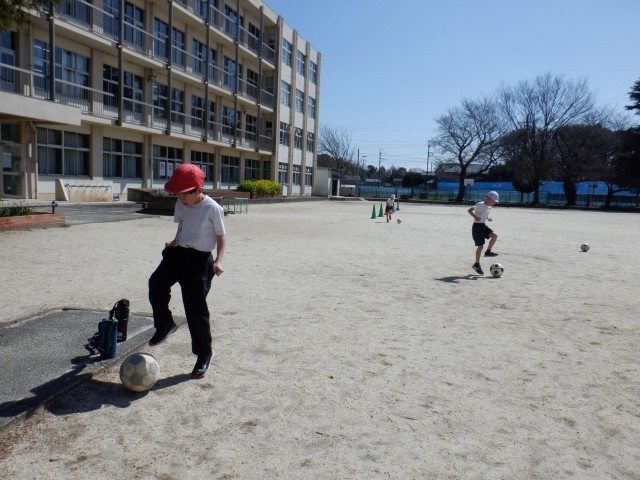 今日から担任の先生が代わりました。青空の下、先生の得意なサッカーの授業をしています。右足、左足、右足、左足・・・と、上手にボールを触っています。