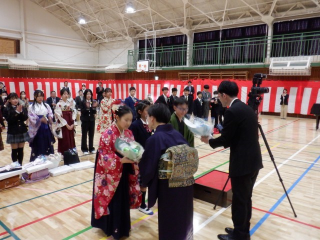 卒業式後は、お世話になった担任の先生と校長先生に、花束を贈呈しました。卒業式の緊張感からも解放され、みんな晴れやかな表情でした。卒対委員の方々が作成してくださった見事なフォトスポットで、思い出の写真をたくさん残すことができました。