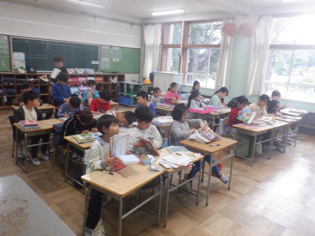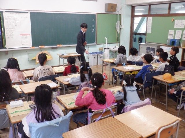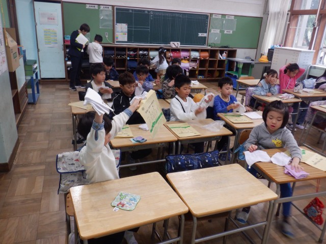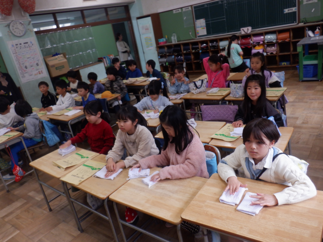 配付物を確認しています。先生の話をよく聞いて、みんなスムーズに行動しているのが立派でした。