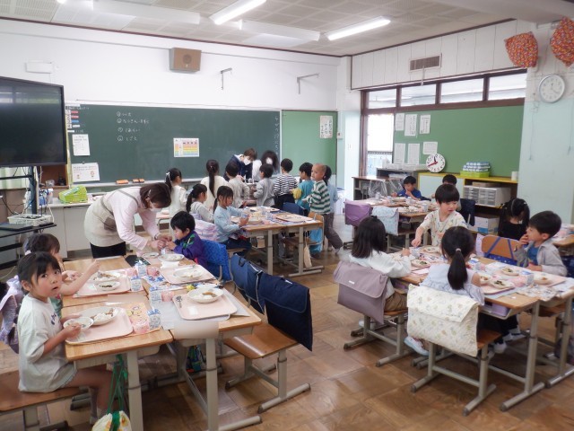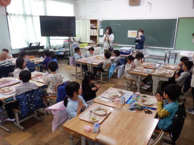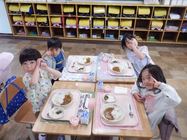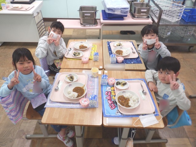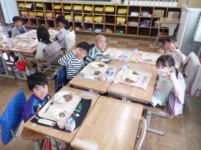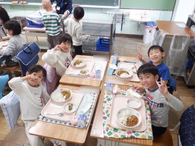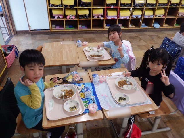 小学校生活初めての給食は、みんな大好きなカレーでした。海草サラダもカレーライスも、みんな美味しい美味しいと言って食べていました。朝から楽しみにしている子が多かったですが、期待どおりの給食だったようです。