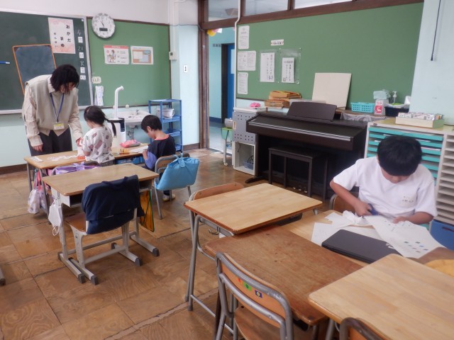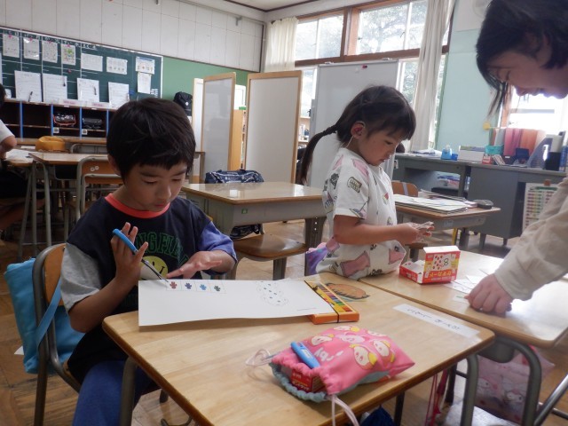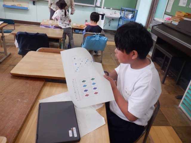 はさみでチョキチョキ紙を切っていました。数字のカードで数を覚えていました。