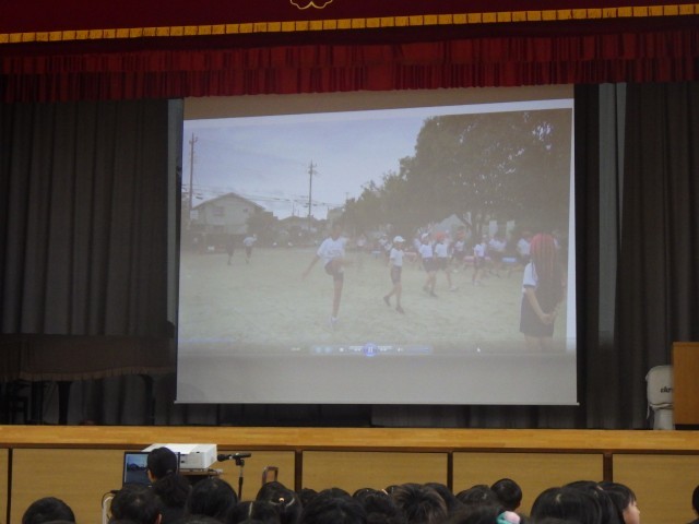 児童会役員の司会のもと、全校児童で選手の活躍を願って激励しました。